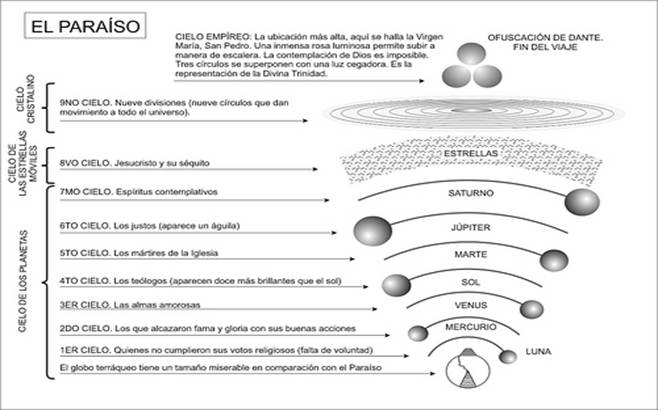 En la transición del pensamiento medieval, teocéntrico, se entiende; al renacentista, antropocéntrico, surge la figura de un hombre, Dante Alighieri, que tras ser desterrado de Florencia comienza a escribir un poema lleno de sensibilidad, alegorías y simbolismo. En él, Dante personifica al ser humano, su amada y musa en la tierra, Beatriz, representa la fé, y Virgilio, autor de la Eneida, simboliza la razón. El poeta se encuentra con éste último y juntos comienzan un viaje por el Infierno, el Purgatorio y el Paraíso, lugar donde Beatriz sustituirá a Virgilio. Ella le llevará hasta el Cielo donde, por intercesión de la Virgen María, podrá ver a Dios.