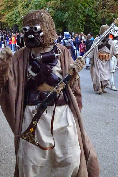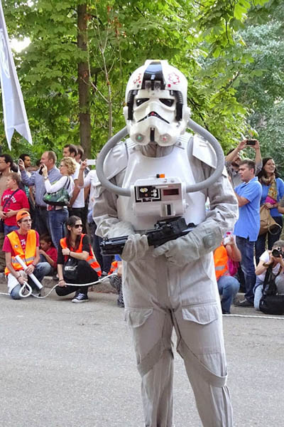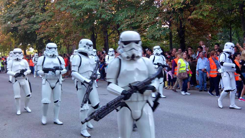 Mis quejas van a cómo se organizó el evento. Más que un desfile de las tropas que componen el universo de Star Wars parecía el muestrario de ropa de los voluntarios que entorpecían, perdón, controlaban a los espectadores. Al final, veías un stormtrooper y un voluntario, stormtrooper, voluntario…en un inacabable suplicio por sacar una foto donde no hubiera camisetas naranjas y amarillas. ¿Tanto les costaba haber dejado a los auxiliares quietecitos en los márgenes de los caminos del Retiro con una vulgar cuerda para delimitar el paso de los fans? Más que el Desfile benéfico de las tropas de Darth Vader parecía el cutre desfile de los auxiliares del Arcoiris.