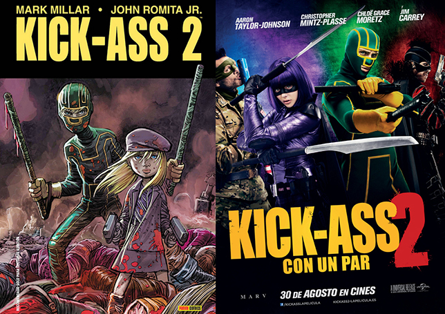 Lo que el Kick Ass 2 nos propone es una versión desproporcionadamente descafeinada de su homónimo en cómic, tomando como base los dos capítulos posteriores: Hit girl y Kick Ass 2, aderezado con escenas de chavales de instituto, romances y situaciones que jamás se dan en la obra de viñetas, algo que no es necesariamente malo, salvo porque las escenas y cambios introducidos banalizan la trama central en vez de reforzarla.